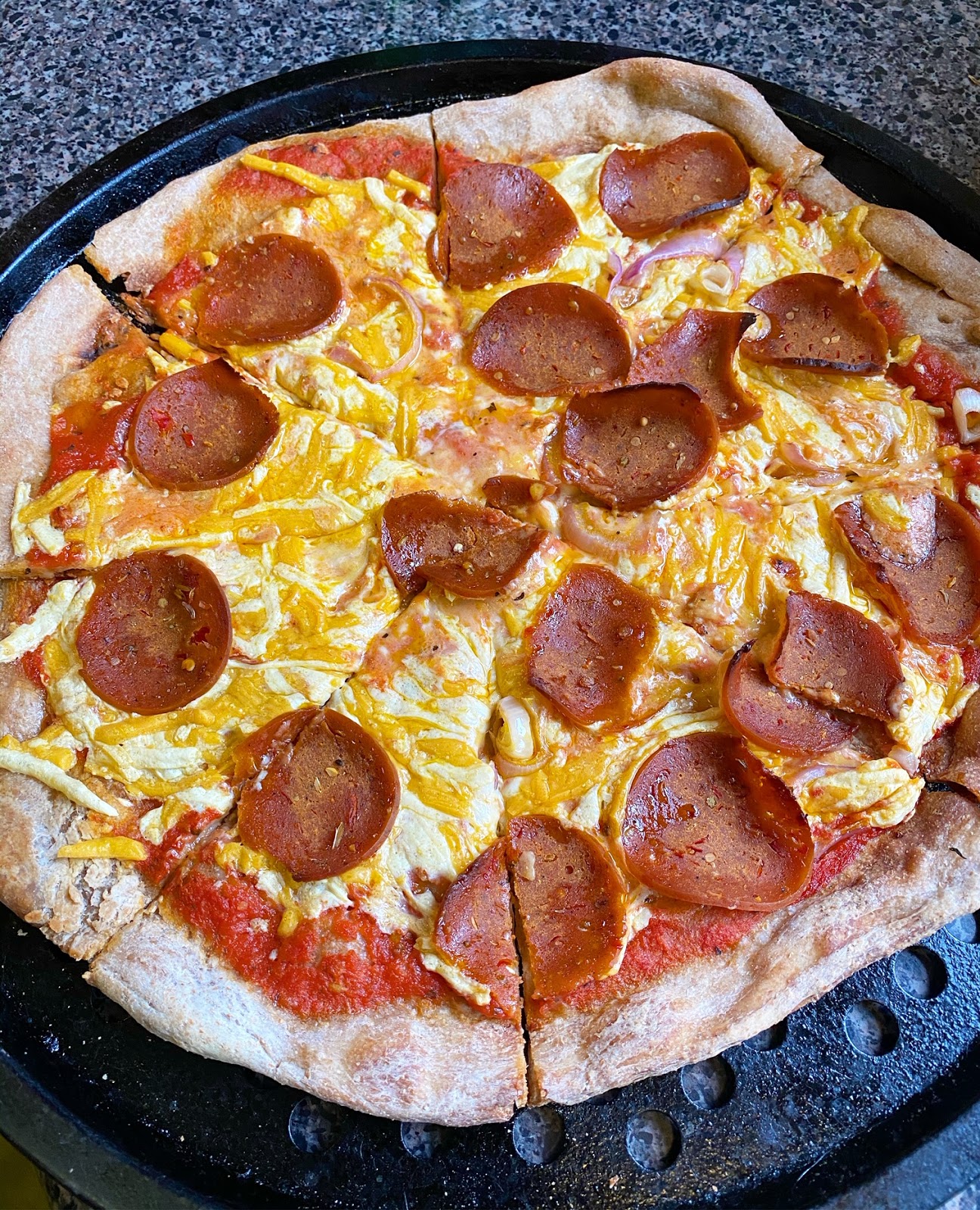 A few months ago, while visiting Nashville, I picked up some locally made BE-Hive seitan pepperoni. I stashed it in the deep freezer until I was ready to make pizza. And that time came on Saturday night! I had some frozen whole wheat pizza dough as well and some leftover homemade marinara. I added Daiya Classic Blend and some sliced red onion, and voila! Vegan Pepperoni Pizza! Y'all, the BE-Hive pepperoni is the best I've ever had!