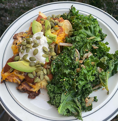 Then, we headed to our usual brunch spot, Graze. They're not open for dining, but there is a big patio space in the complex they share with several other businesses. We grabbed a table, and I enjoyed a Breakfast Burrito (seitan chorizo, cashew cheese, roasted potatoes, tofu scramble, avocado) while Paul had his usual biscuits and seitan chorizo gravy.
